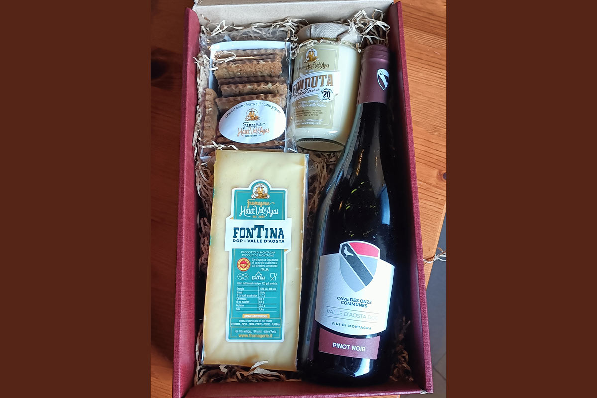 Composto da: n. 1 Fontina Dop 300g, n. 01 Vino rosso “Pinot Noir”,n. 01 Fonduta da 295g, 1 confezione gallette biscotti dolci.