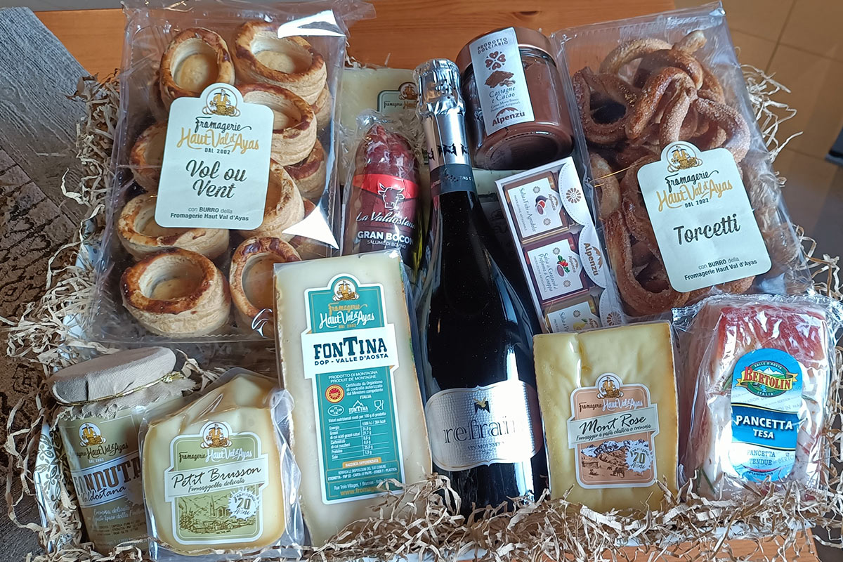 Composto da: 1 Bottiglia di Refrain “Vin Mousseaux”; 6 pezzi di formaggi da 300g(Fontina DOP, Toma Graines, Fromage du Montrose, Toma ortica e calendula, Bleu d’Aoste, petit Brusson); 1 Salame Gran Bocon; 1 fonduta da 295 g; 1 Vol au Vent; 1 confezione di torcetti; Confettura castagne e cacao;n. 01 blister salse per formaggi; 1 pz Pancetta Tesa.