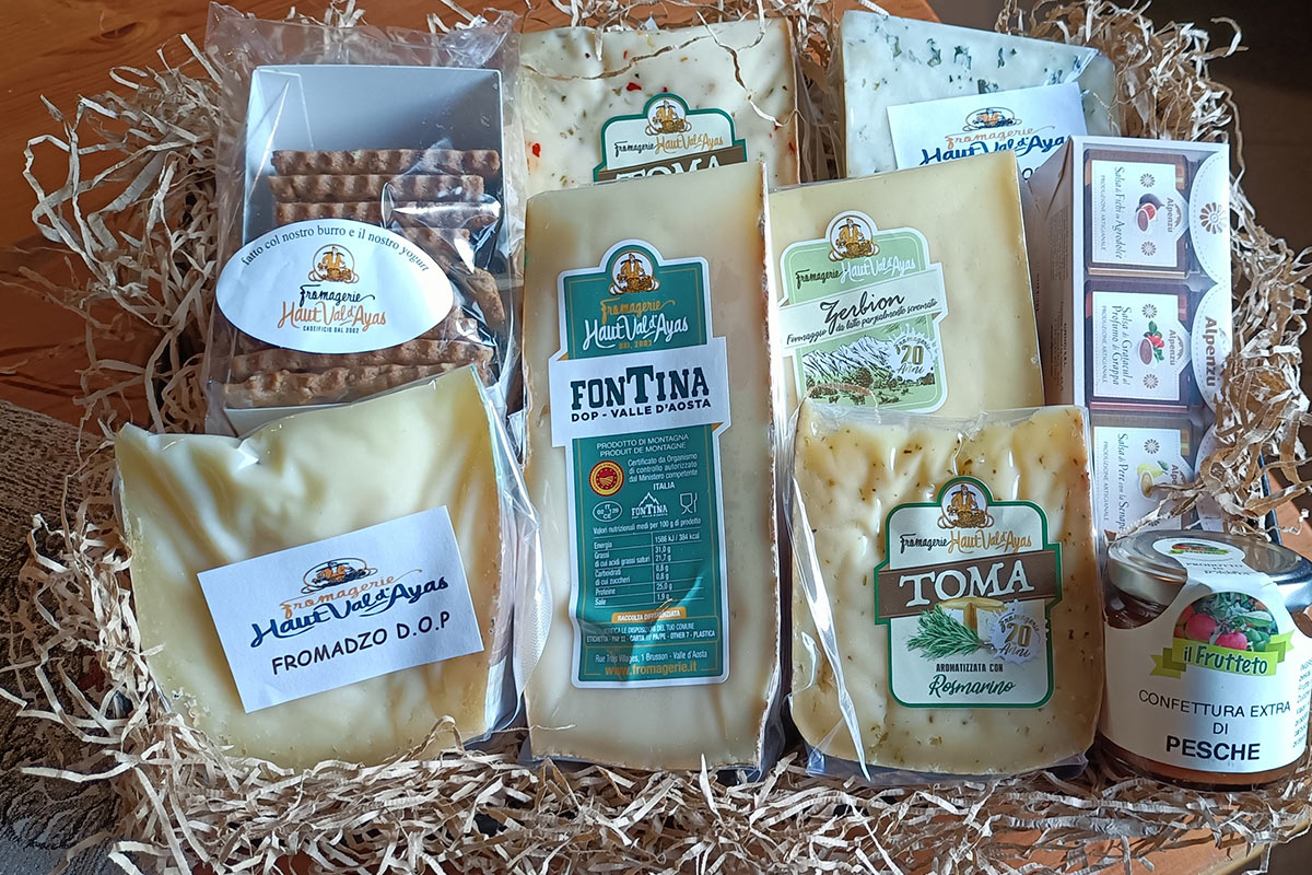 Composto da: 6 pezzi di formaggio da 300 g (Fontina DOP, Fromadzo DOP, Toma semigrassa Zerbion, Bleu d’Aoste, Toma al rosmarino , toma alle erbe di montagna); salse per formaggi; gallette biscotti dolci, confettura da 100g Il Frutteto