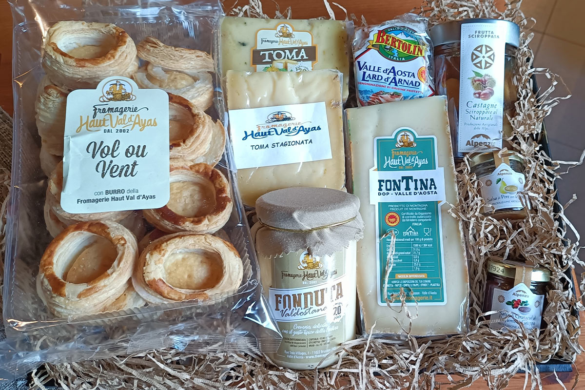 Composto da: Fontina DOP da 300g; Toma stagionata 300g ; Toma Ortica e Calendula 300g; Fonduta da 295 g; Vol au Vent; Lardo d’Arnad trancio; Castagne al naturale; 2 salsine per formaggi.